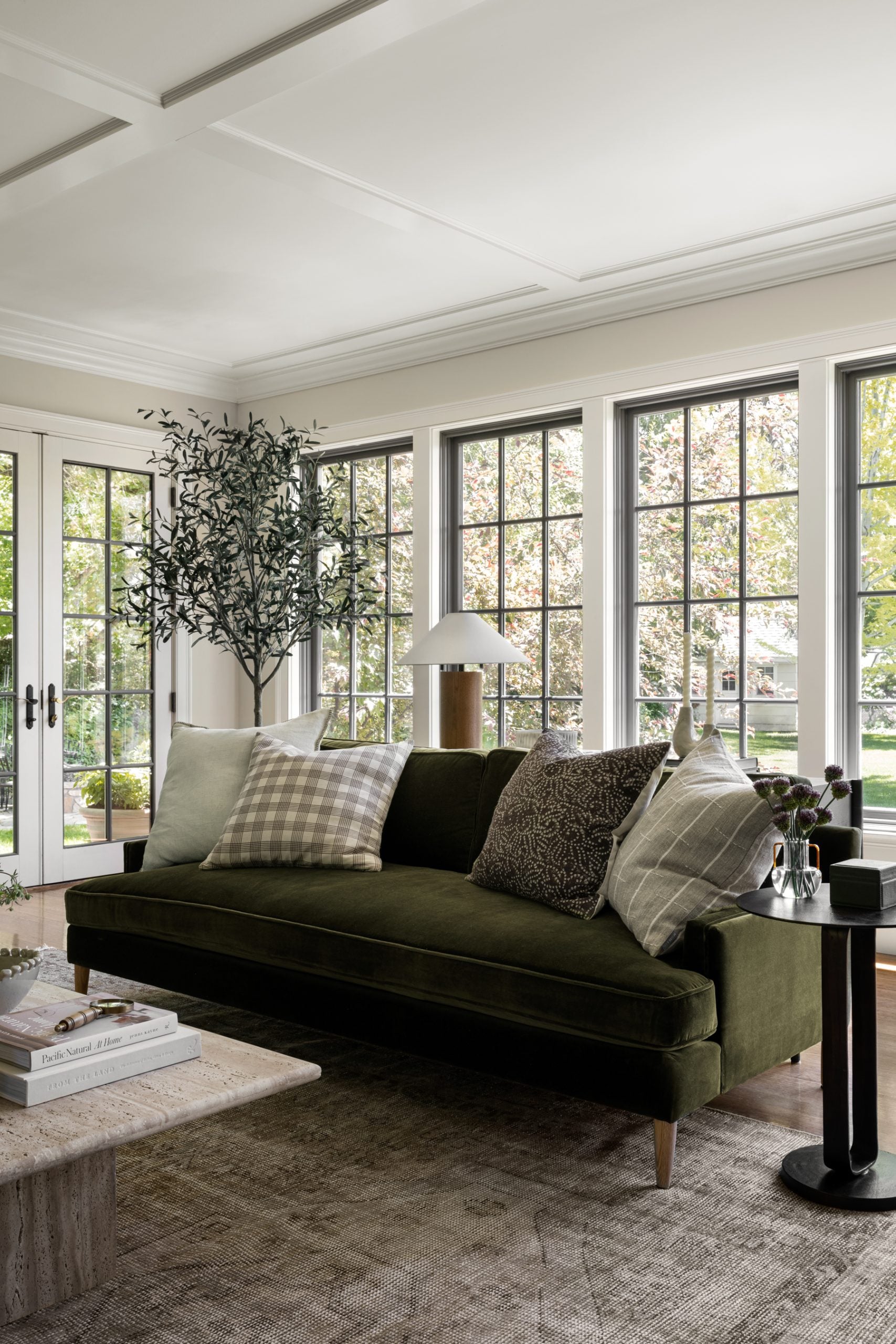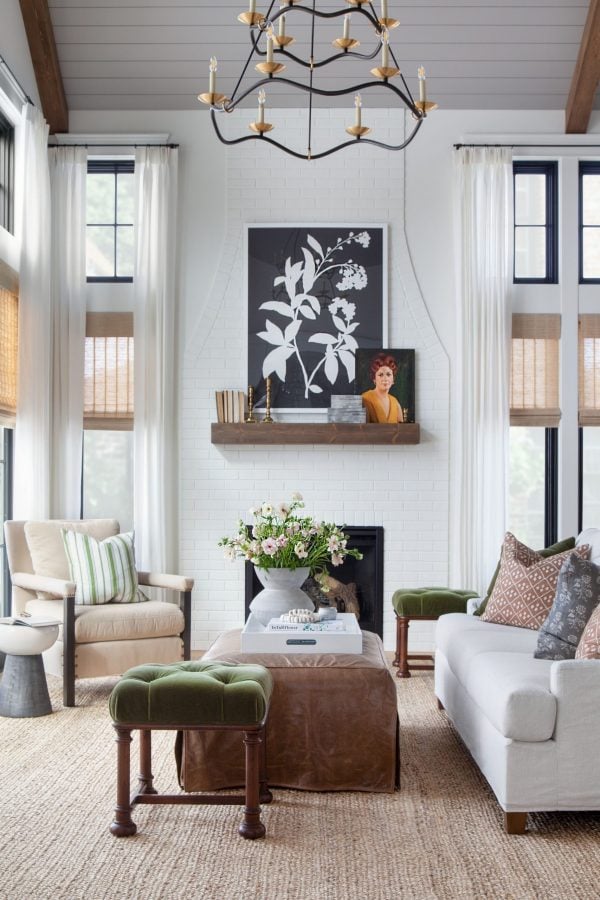 One of the most affordable and easiest ways to incorporate some green into your home decor is with a few pillows. These green throw pillows below are so striking on the white couches.