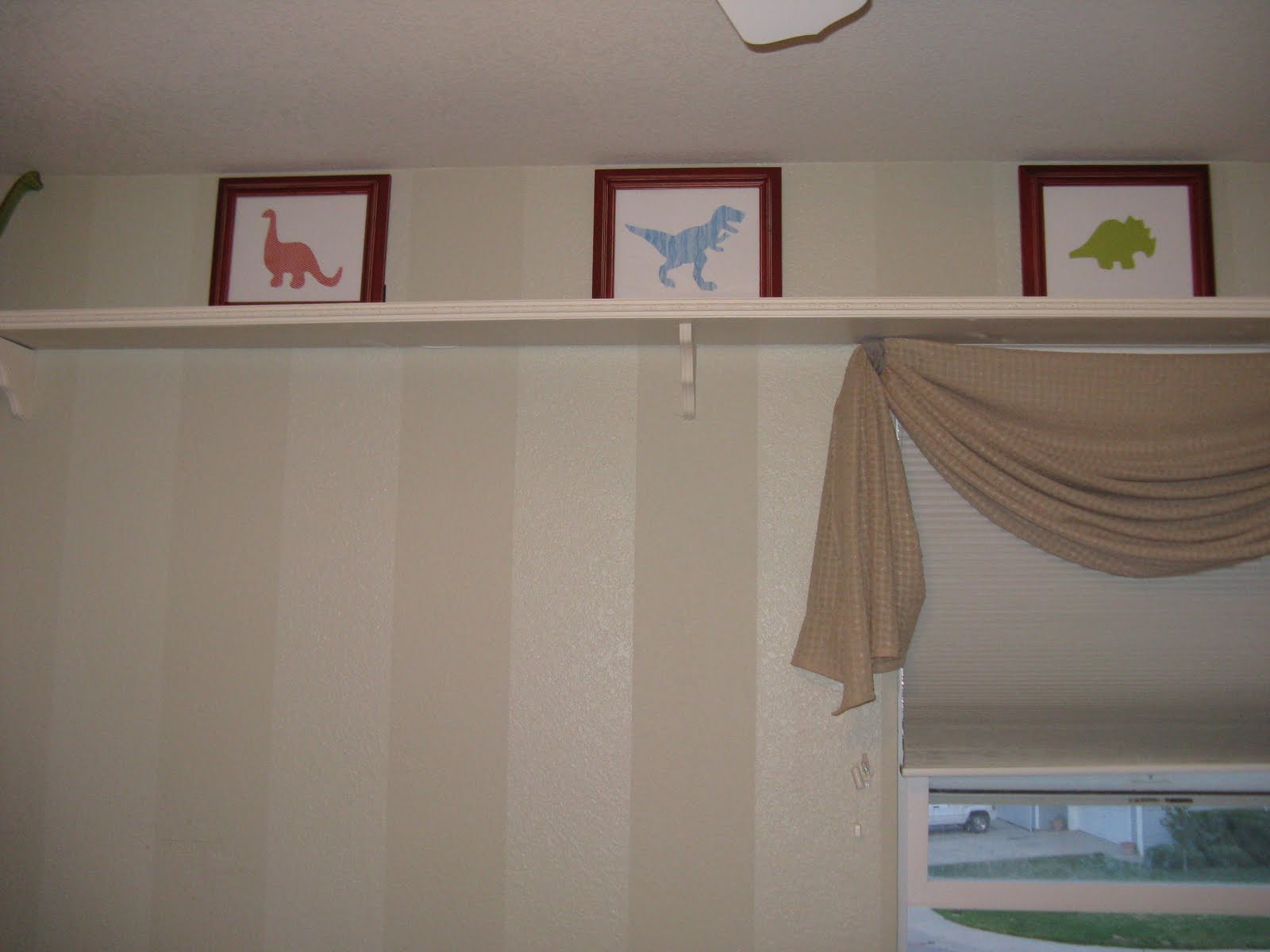 When the time came to change my son’s nursery into a preschoolers room, I decided the new theme for his room would be dinosaurs. My son has an upper shelf border along the top of his walls and I have been struggling to find the perfect dinosaur decoration for this space. And then it hit me in the middle of the night…dinosaur silhouettes!