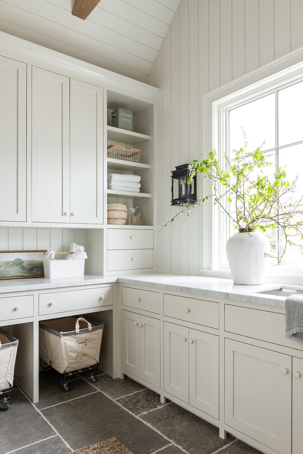 And it can be a beautiful paint color option for contrasting trim or wall treatments as seen on this shiplap wall below.