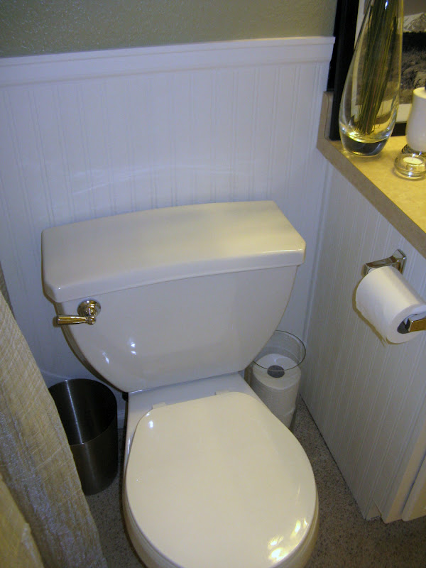 That is an absolutely FABULOUS make-over. I love the colors you used. In fact, I love them so much, I’ve used something similar in my own bathroom make over that still is not finished (since November 2009). Not a joke, just a testament to me being lazy, I guess. The black and white, the cream and beigey-tan accents and the wall color (I call it wet sand or peanut butter, depending on my mood), it’s clean and classic. LOVE the bead-board wallpaper. Your guests will be very happy in this bathroom. What an excellent re-do! Thanks so much for the added inspiration/impetus I need to get mine finished now.