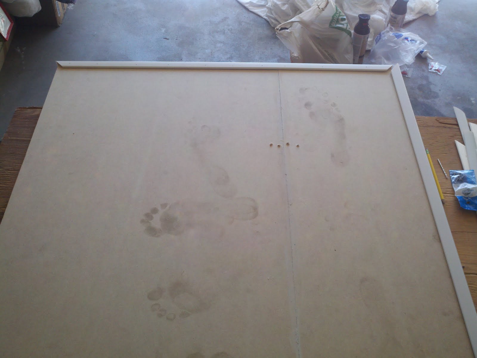 Do you like the foot prints?? Nice, huh? Apparently walking around barefoot in your garage can get your feet rather dirty! It’s ok though…that will be our little ‘dirty’ secret!